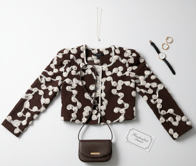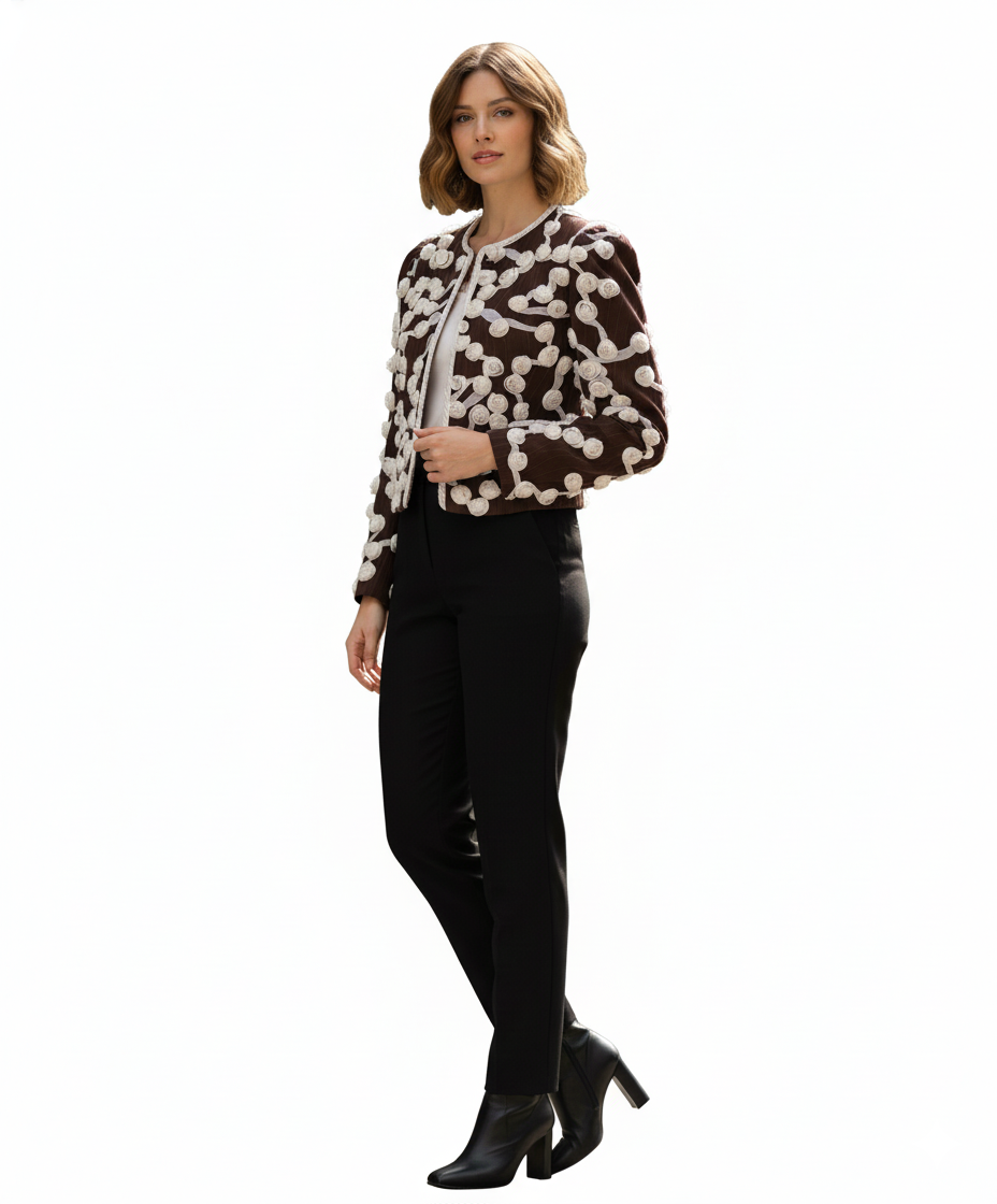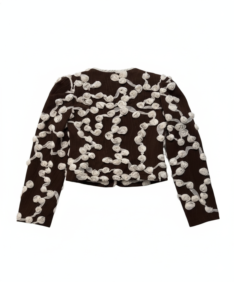 Elevate your style with our Elegant Rosette Embellished Jacket. This exquisite brown jacket features delicate white rosette detailing, offering a unique and sophisticated look. Perfect for adding a touch of charm to any outfit, it's a versatile piece for special occasions or to elevate your everyday ensemble.