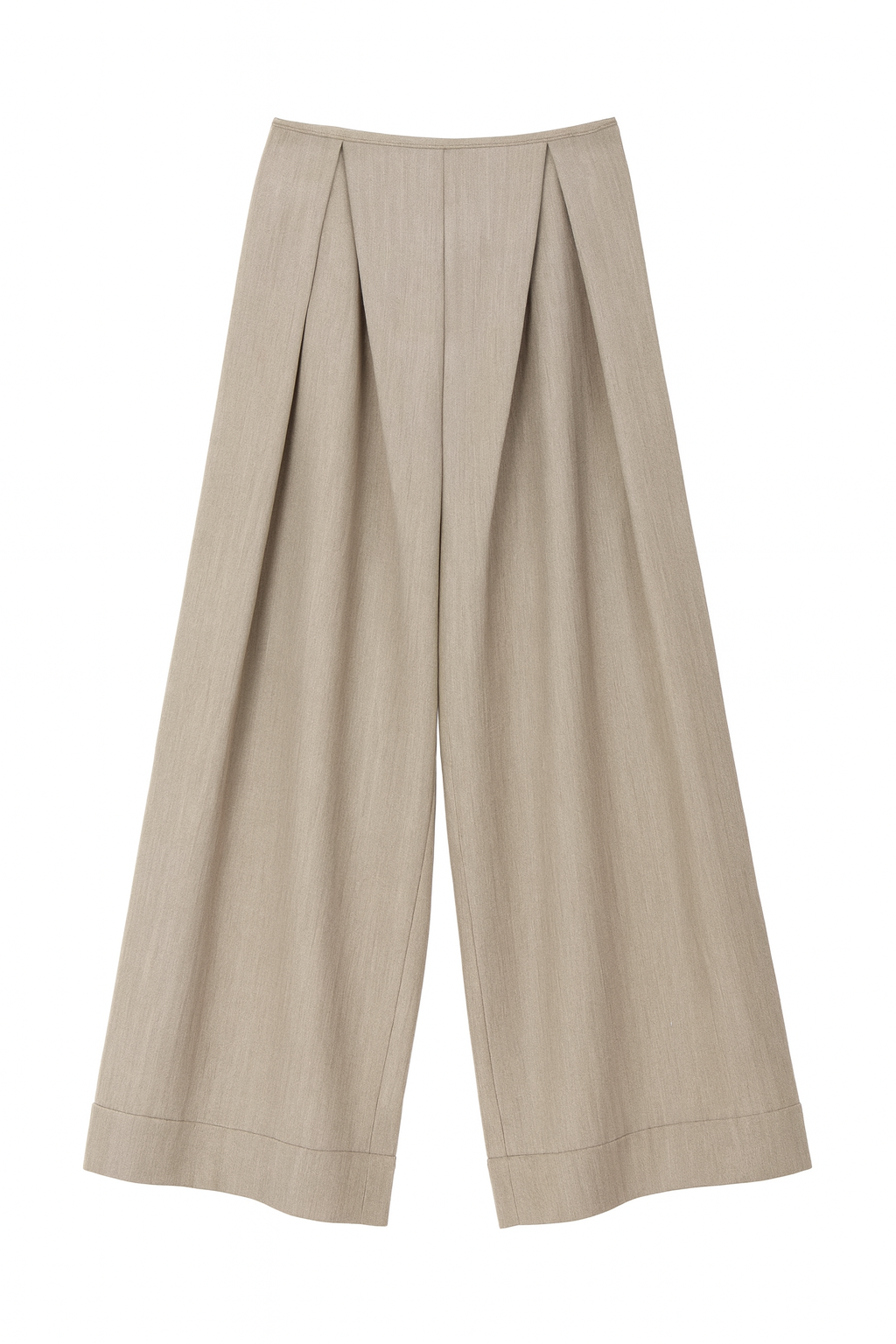These tailored wide-leg trousers redefine modern elegance with their sculptural pleats and effortless drape. Crafted from a soft, lightweight woven fabric in a refined beige hue, they feature a high-rise waist, structured front pleating for added volume, and a clean, elongated silhouette. The double-fold cuffs lend a polished finish, making them versatile enough for both professional settings and elevated casual wear. Pair them with a crisp blouse for the office or a relaxed knit for a chic off-duty look.