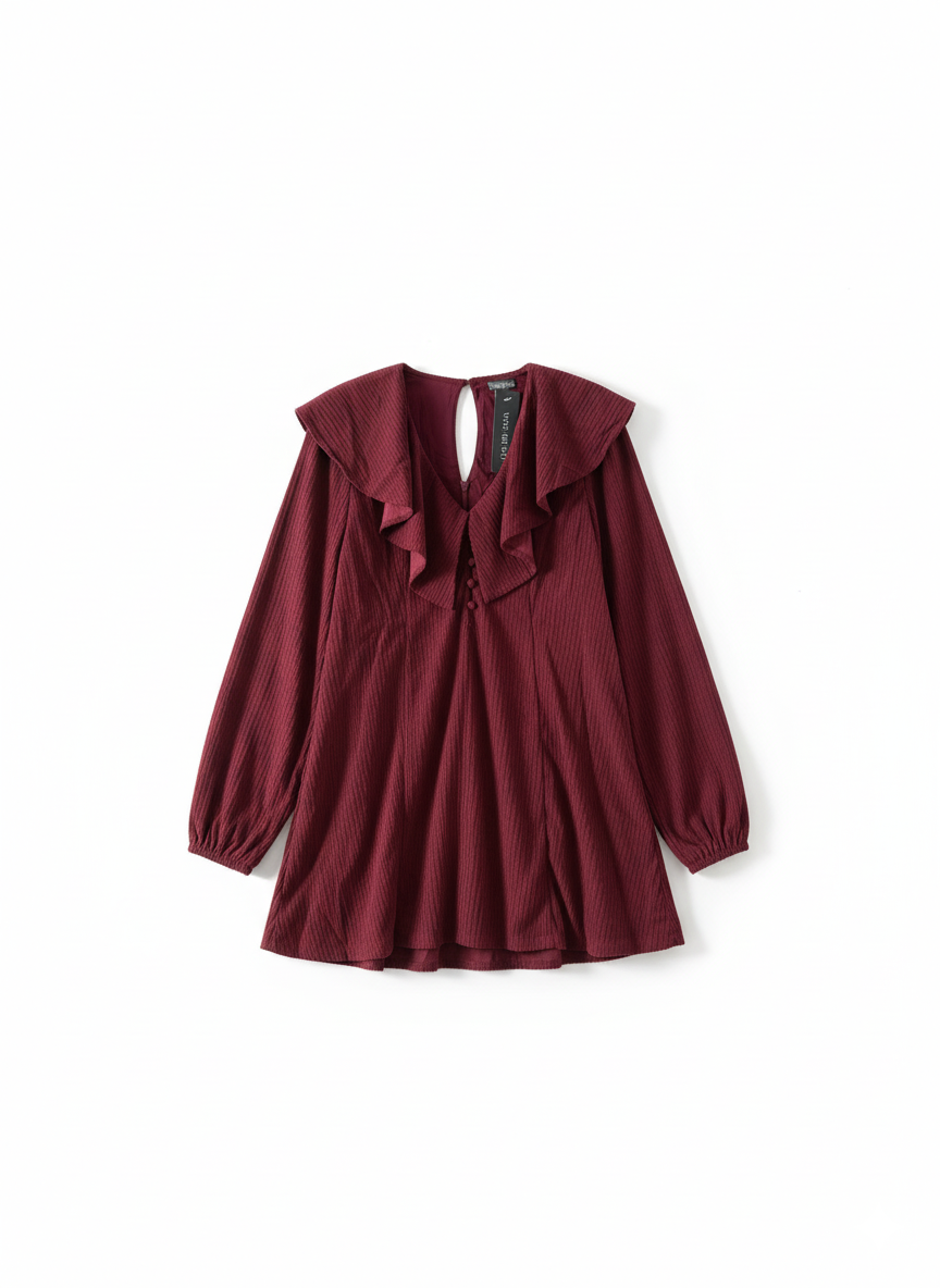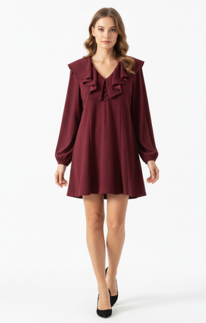 Step out in style with our "Crimson Ruffle" Mini Dress, a charming and chic piece perfect for any occasion. Crafted in a rich crimson hue, this dress features an elegant ruffled collar and a flattering