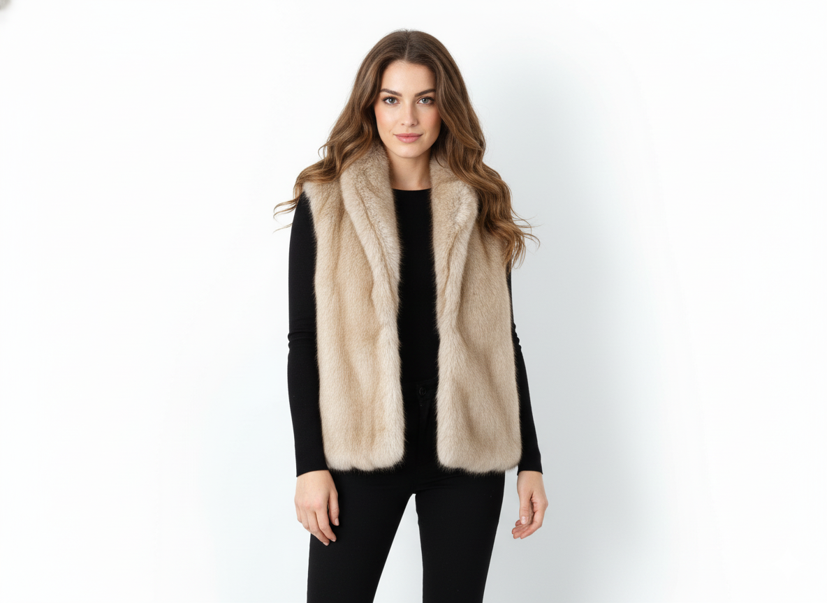 Elevate your layering game with our Champagne Faux Fur Vest. This exquisite vest offers a plush, soft texture and a stunning champagne hue, providing instant glamour and warmth without bulk.