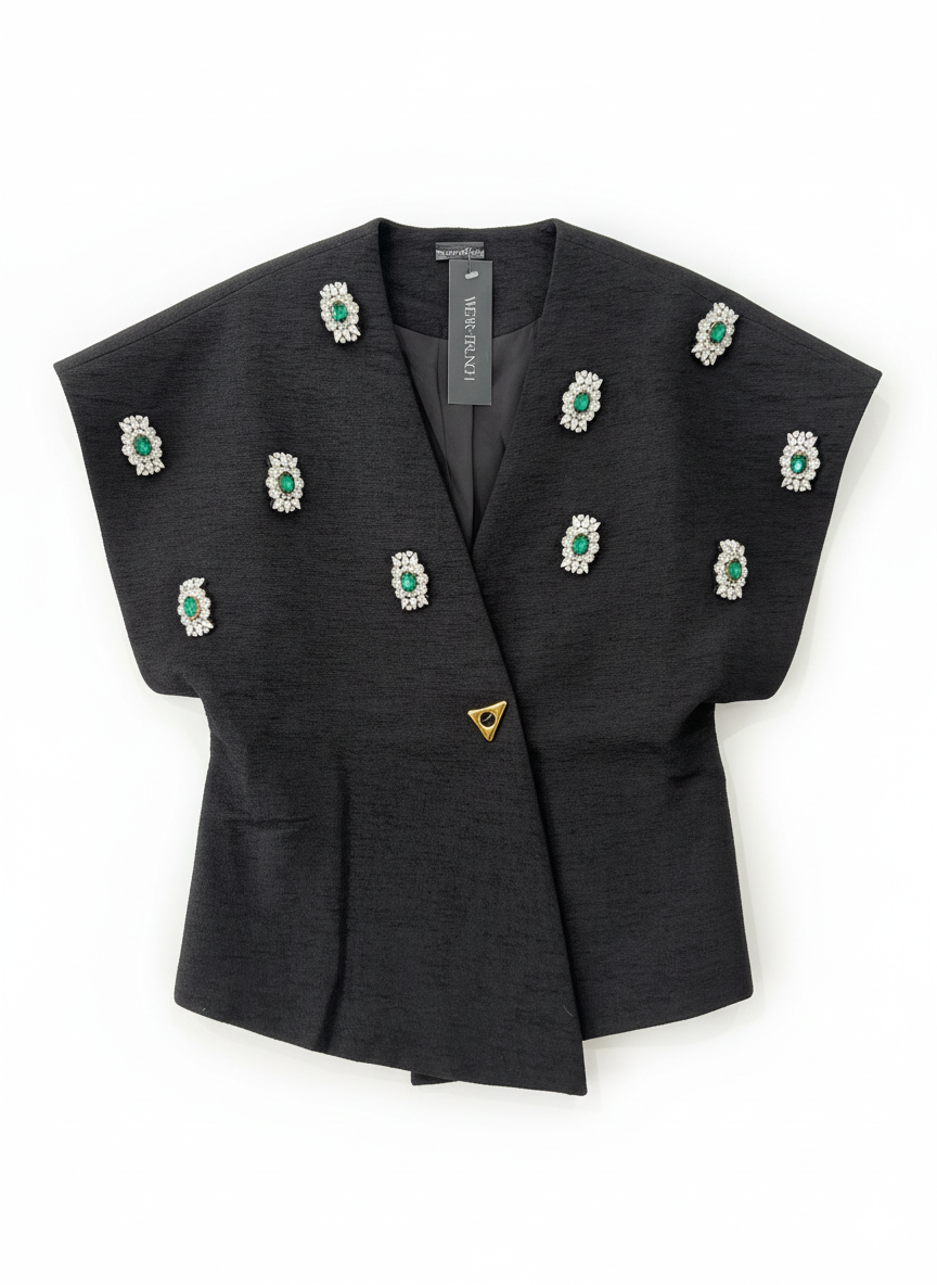 Elevate your wardrobe with our stunning Embellished Drape Top. This black textured top features a chic draped silhouette, beautifully accented with sparkling emerald and crystal embellishments. A unique gold triangular clasp adds a modern touch to its sophisticated design.