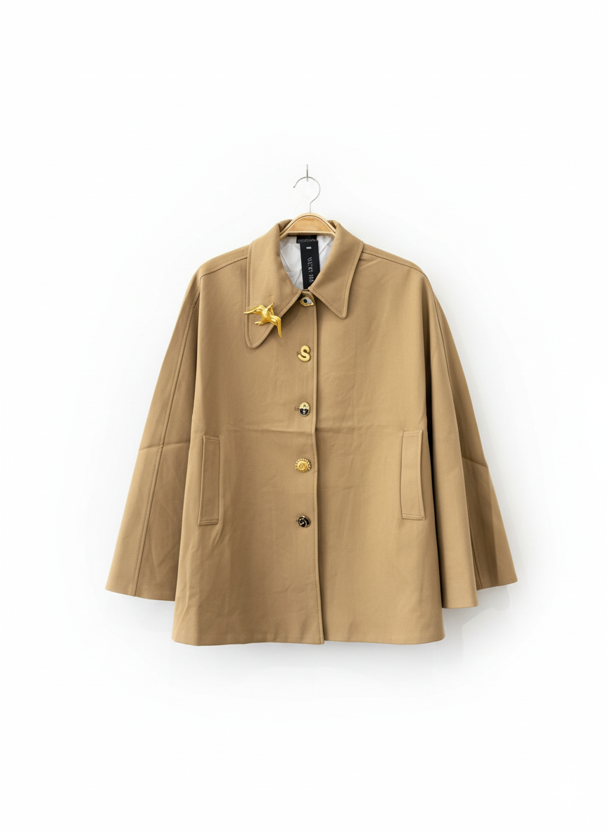 Adorned with a distinctive golden bird brooch, this poncho trench is designed for those who appreciate refined details and effortless style.