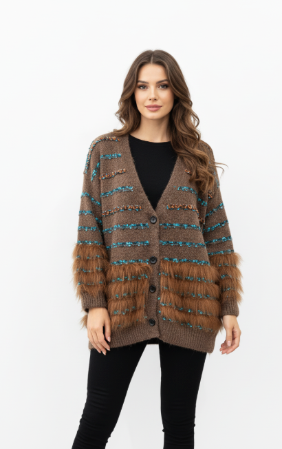 Embrace unique style with our "Artisan Texture" Cardigan. This captivating knit features a rich brown base adorned with vibrant turquoise and orange woven accents, complemented by luxurious faux fur detailing on the sleeves and hem.