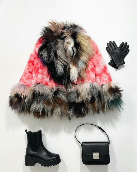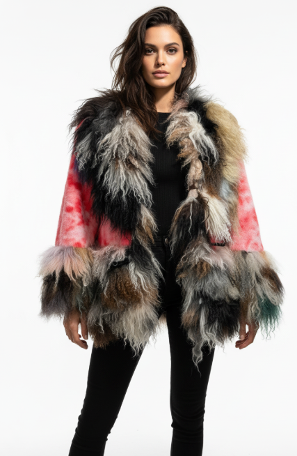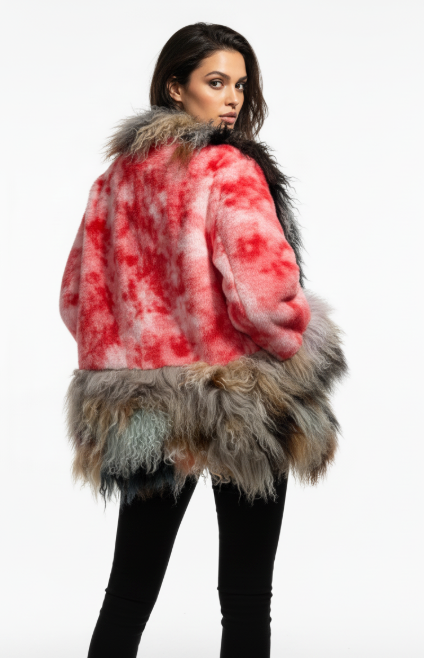 • Unique Patchwork Design: Combines a tie-dye inspired body with a multi-textured faux fur trim for a distinctive look.