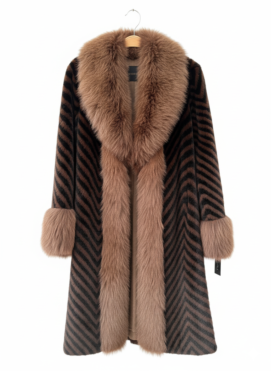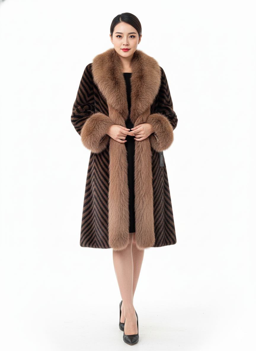 Envelop yourself in the luxurious warmth and distinctive style of our "Sable Serenade" Striped Fur Coat. This elegant piece features a striking diagonal striped pattern in rich brown and black hues, creating a visually dynamic texture.